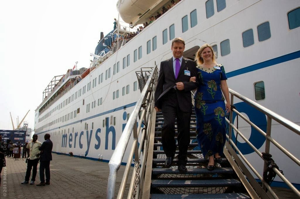A poignant moment indeed; Mercy Ship's founder Don Stephens and his wife, Deyon stand on the dock, waving in the Africa Mercy. After 38 years at the helm, they had yet to see a Mercy Ship sail into port. They purposefully chose this historic moment as Mercy Ships breaks new ground into Central Africa, as their time. |